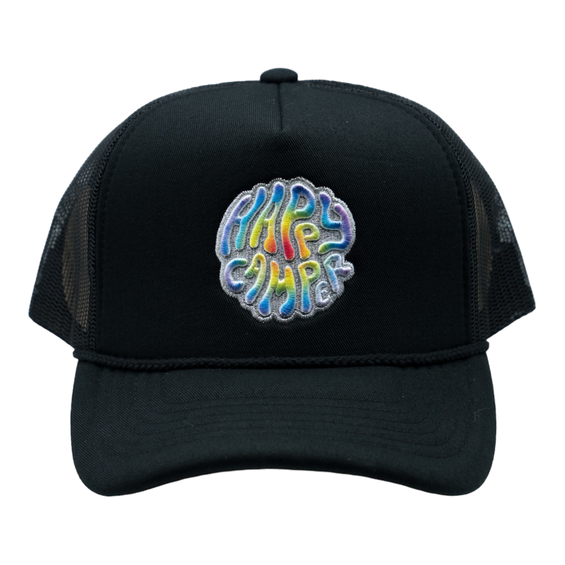 This 5-panel foam trucker hat features a custom Happy Camper embroidery on the front.