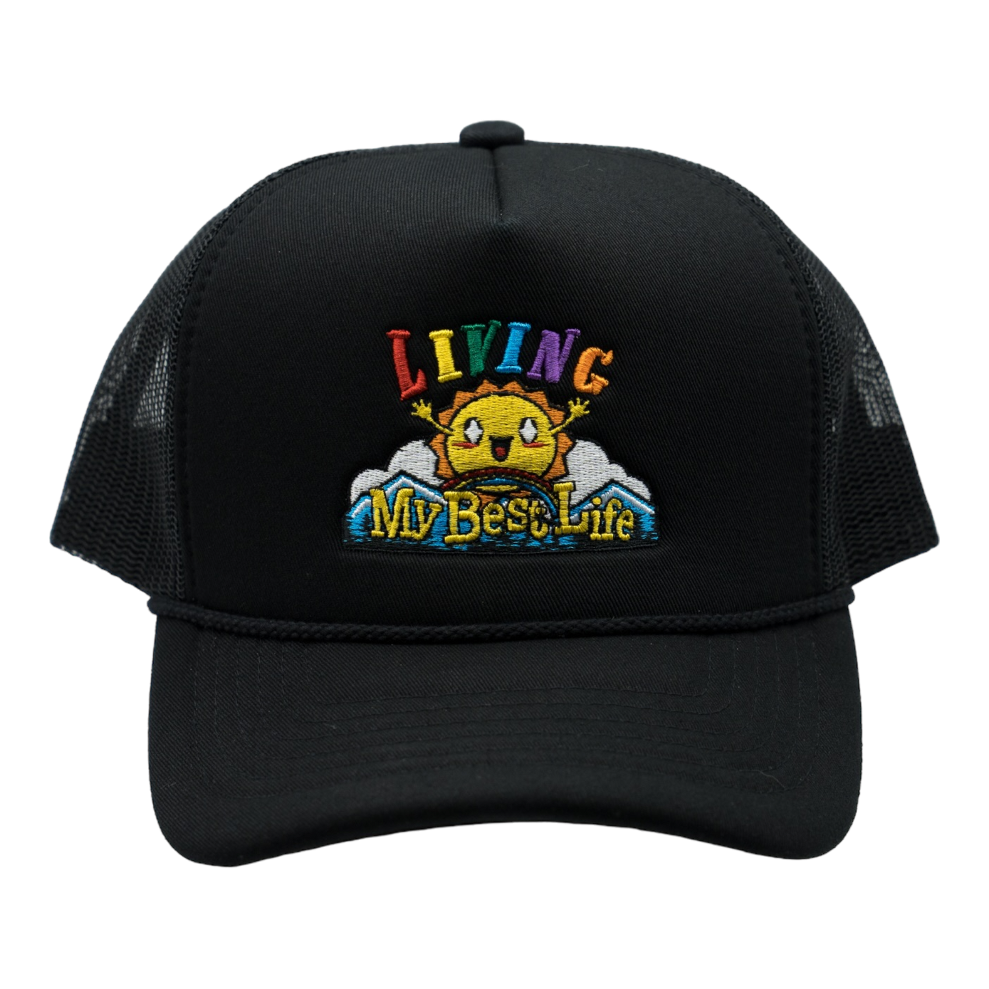 This 5-panel foam trucker hat features a custom Living My Best Life Sunshine embroidery on the front.