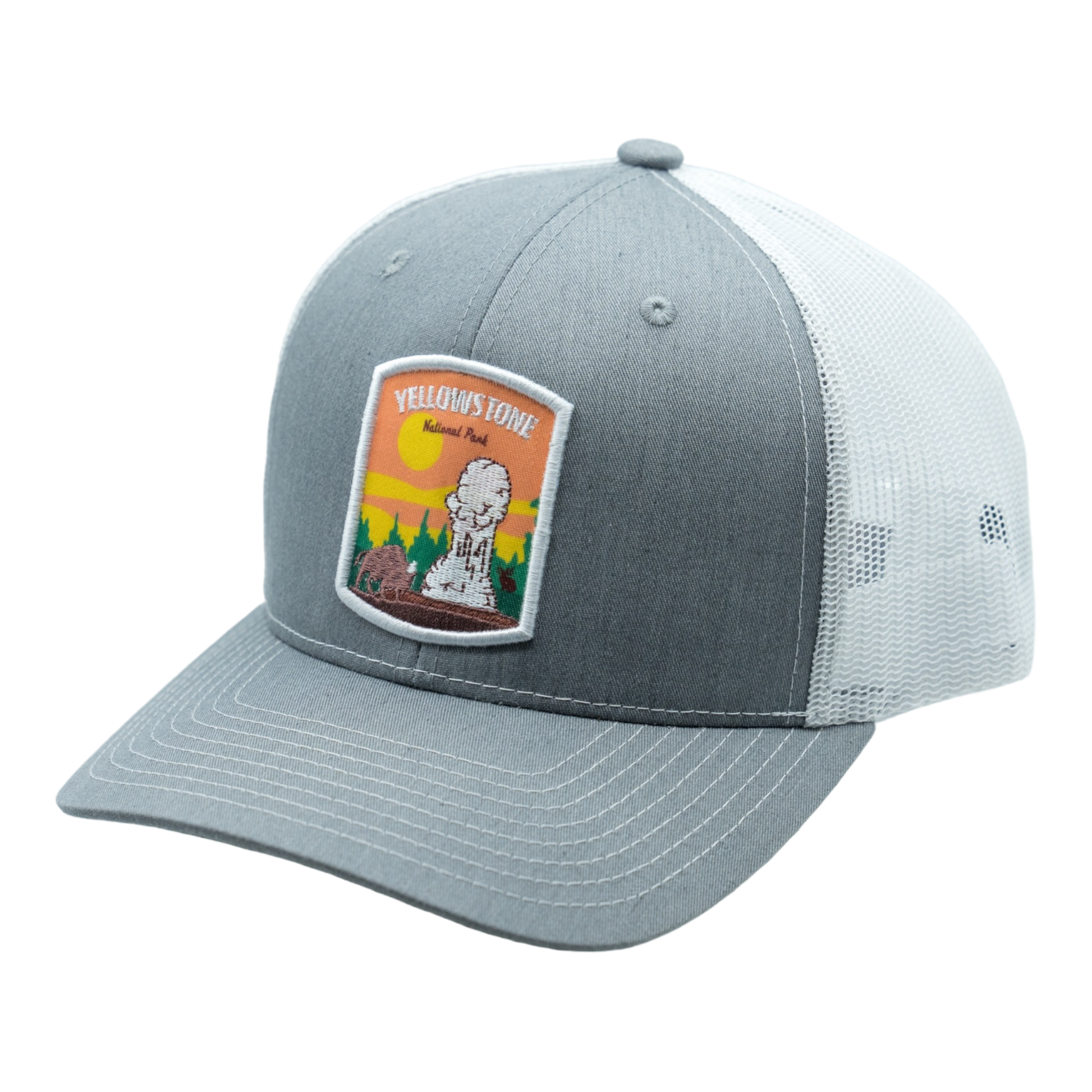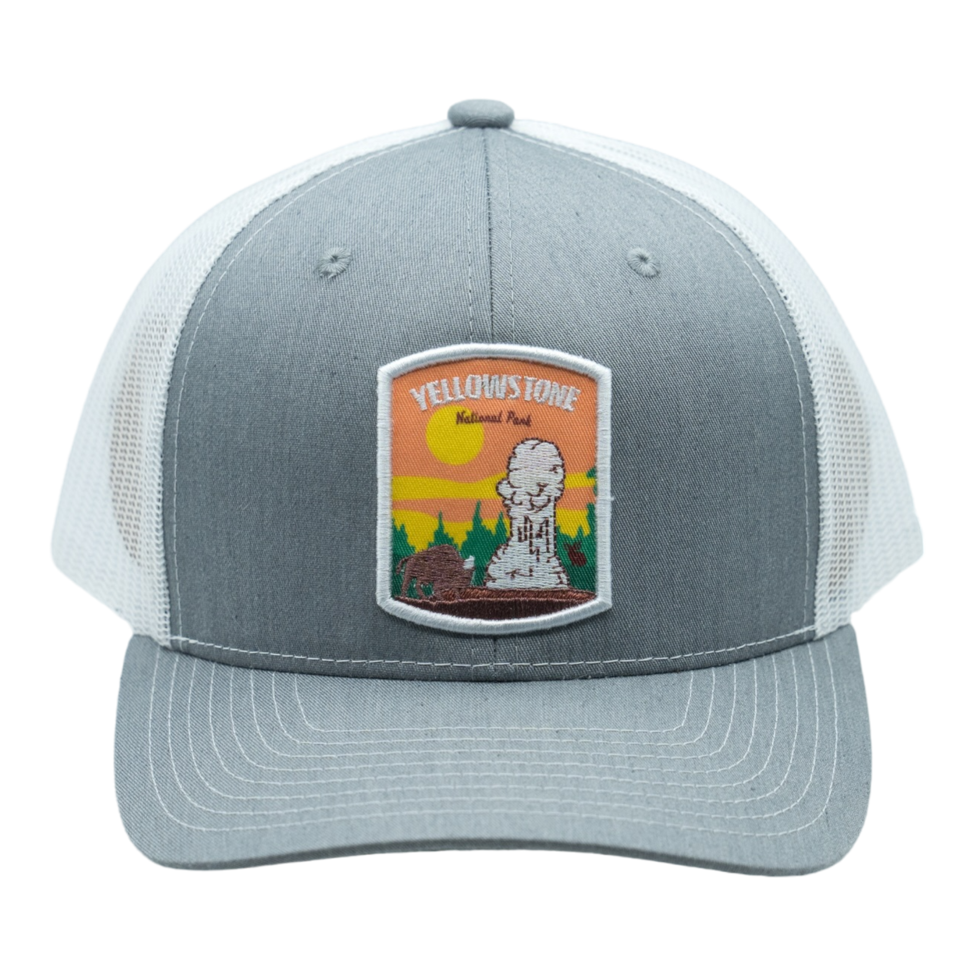 This 6-panel trucker hat features a custom Yellowstone National Park Patch on the front.